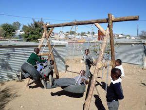 Voor de grotere kinderen zijn er achter het gebouwtje schommels, verder is de ruimte te beperkt voor een goede speelgelegenheid. Als er een nieuw gebouw is komt er ook voor hen een veilige speelplaats.